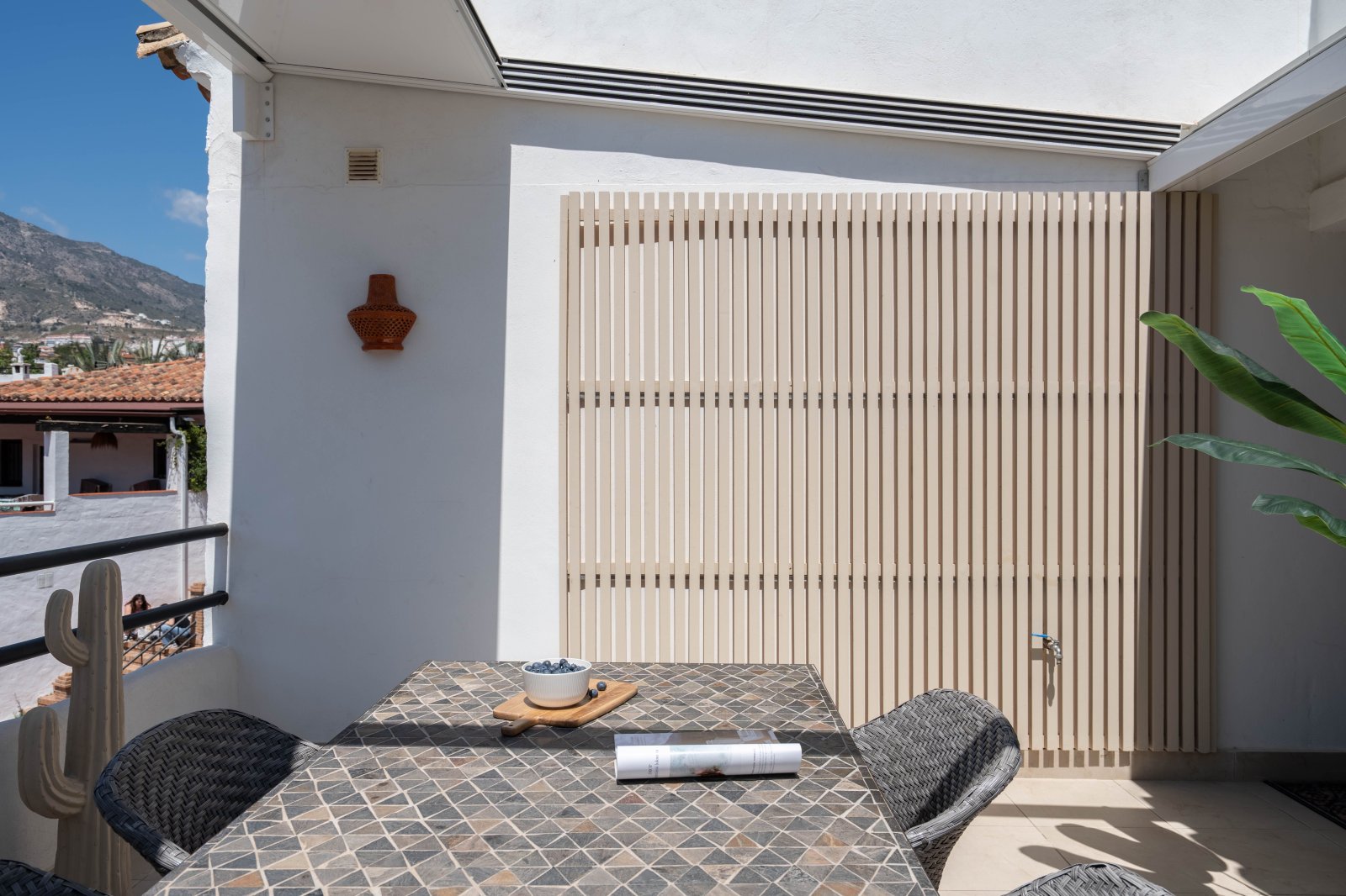 The Pueblo Evita community offers beautifully maintained swimming pools, its own restaurants, and excellent accessibility. And as a rare highlight for this area, the price also includes a private garage space – and with the garage comes a Mini Cooper (as seen in the photos).